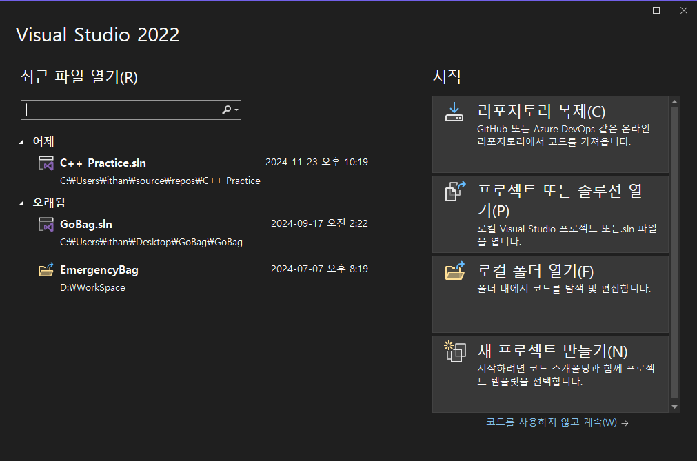 비주얼 스튜디오를 실행시키시면 기본설정을 하게 됩니다. 테마나 계정 연결 등은 원하시는대로 하시면 됩니다. 그런 다음 비주얼 스튜디오를 실행시키시면 다음과 같은 화면이 나옵니다.