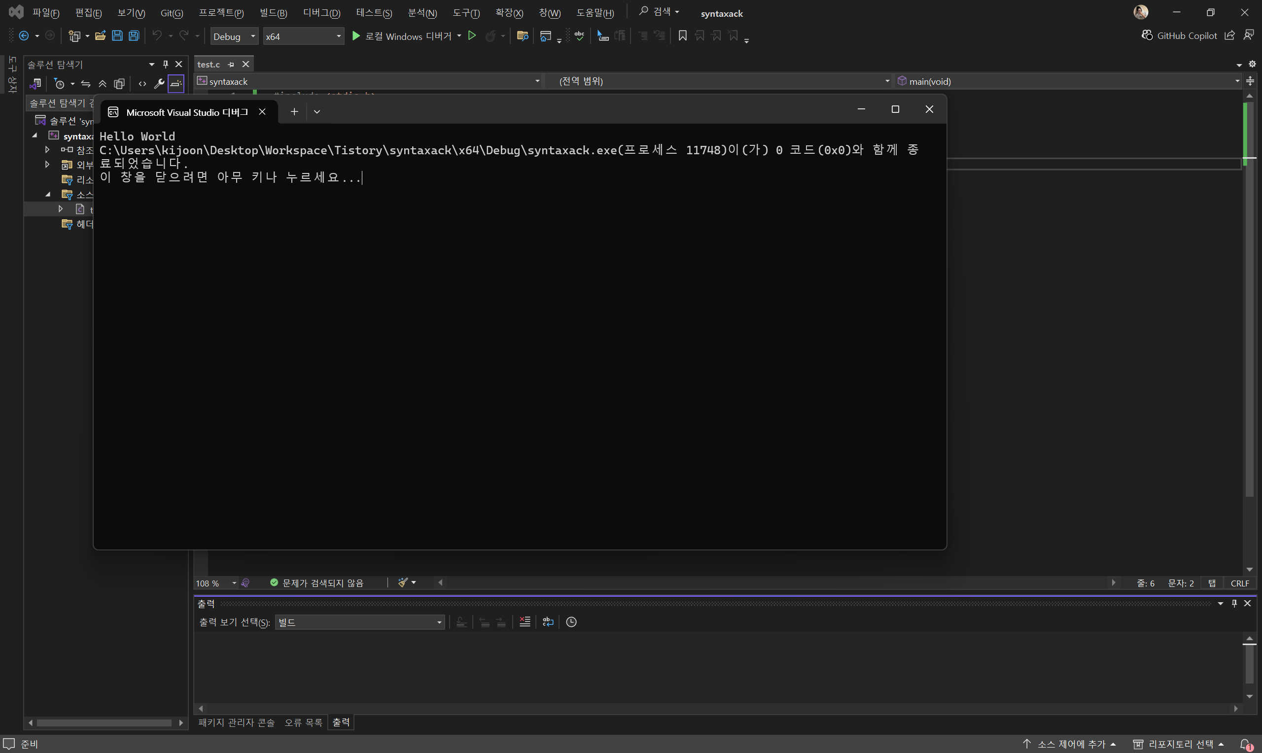 Ctrl + F5를 하여 디버그 없이 실행하면 Hello World가 출력되는 것을 볼 수 있습니다.
