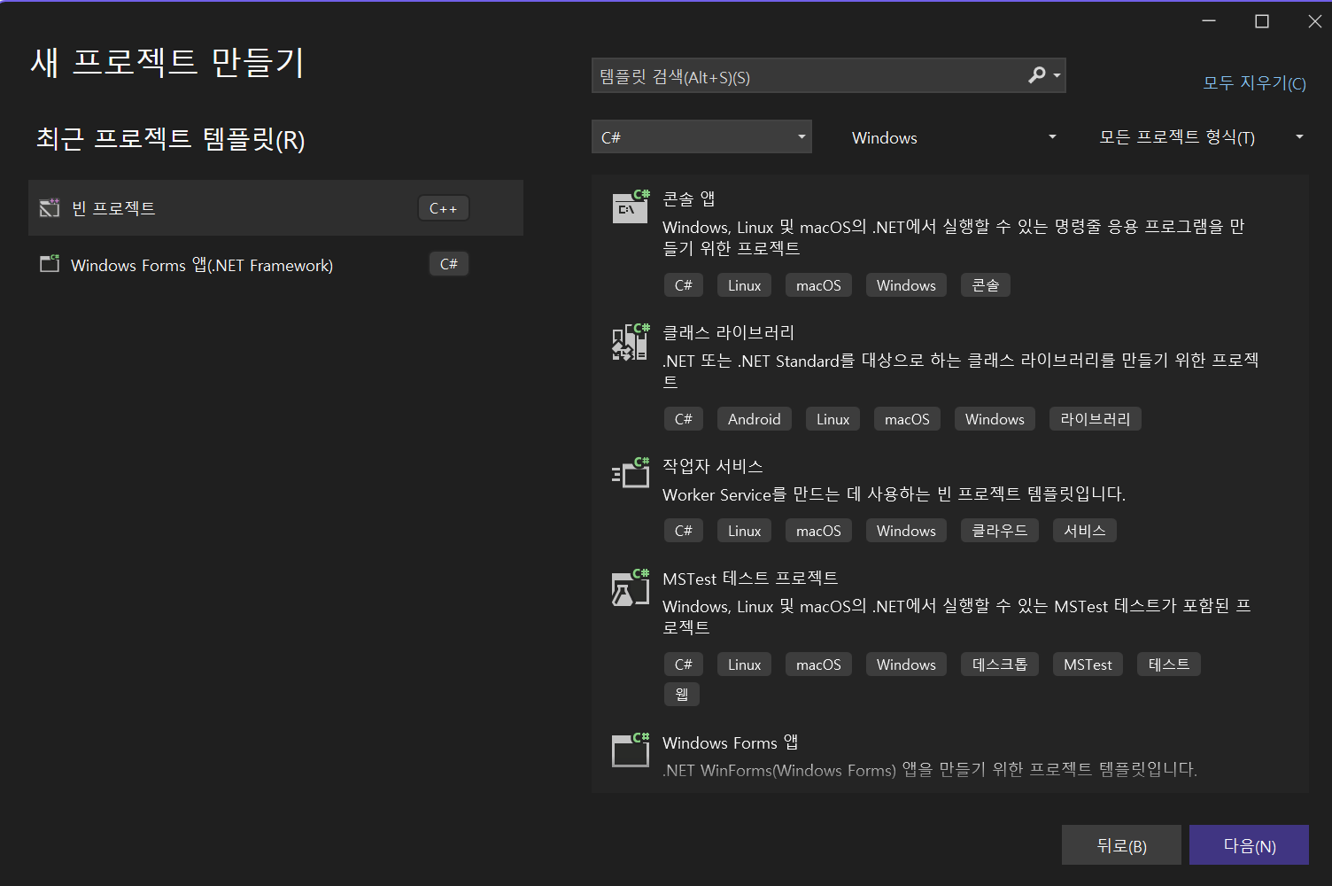 Visual Studio를 실행해서 새 프로젝트 만들기를 눌러주세요.