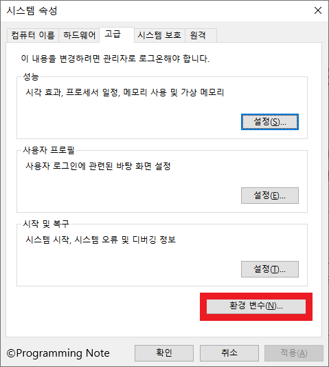 고급 시스템 설정 버튼 클릭 후 환경 변수 버튼 클릭