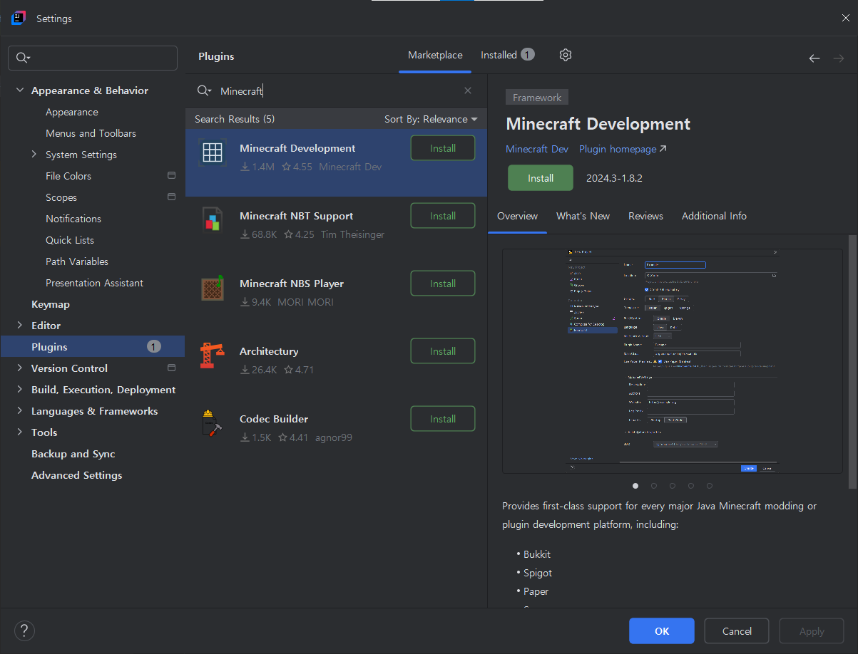 먼저 Minecraft Development 라는 플러그인을 다운로드 받으셔야 합니다. Settings에 가셔서 Plugin 탭에서 다운로드 받으세요. 다운로드 받으셨으면 이제 새로운 프로젝트를 생성할 것입니다.