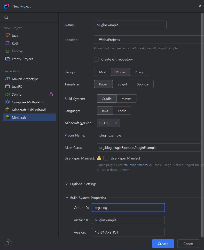 새 프로젝트 생성에서 위와 같이 해주시면 됩니다. 마인크래프트 버전은 여러분이 사용하실 버전으로 설정해주시면 됩니다. Class 이름을 위와 같이 역도메인으로 적는 이유는 관습의 이유도 있고 출처의 고유성 등으로 적습니다. 원래 보통 깃허브 도메인 반대로 적습니다.