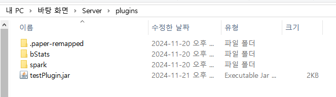 아까 build.gradle에서 설정한 경로대로 플러그인 파일이 생성되는 것을 확인할 수 있습니다. 만약 다른 경로로 설정하신 분들은 플러그인 파일을 서버폴더의 plugins 폴더 안에 집어 넣으시기 바랍니다.