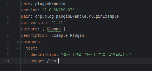 plugin.yml은 플러그인의 메타데이터와 기본 설정을 정의하기 위해 사용하는 파일입니다. 이 파일은 플러그인이 로드 될 때 서버가 플러그인에 대한 정보를 읽고 관리할 수 있도록 도와줍니다. 플러그인의 정보, 명령어 등록, 플러그인 의존성 설정, 기타 설정 등을 할 수 있습니다. 우리는 새로운 명령어를 만들었기 때문에 새로운 명령어 등록을 해보겠습니다.