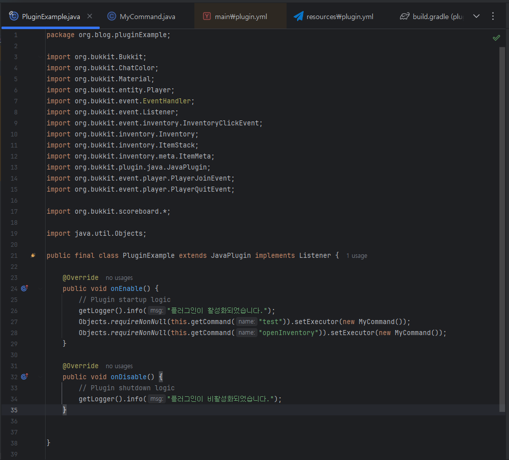 코드는 PluginExample 클래스에서 진행하도록 하겠습니다. 위의 코드에서 그 전 강의와 다른 모습이 보이는 것은 제가 실험하면서 남은 코드이니까 신경 안 쓰셔도 됩니다. 여러분은 onEnable과 onDisable 함수만 구현되어 있을 것입니다.